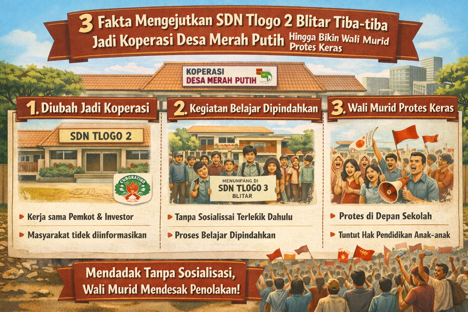 Masalah SDN Tlogo 2 Blitar tiba-tiba jadi Koperasi Desa Merah Putih harus segera mendapatkan solusi permanen. Pendidikan adalah investasi masa depan yang tidak boleh dikorbankan demi kepentingan komersial. Semoga pemerintah Kabupaten Blitar mampu bersikap adil dan segera mengembalikan ketenangan di SDN Tlogo 2. Mari kita kawal bersama agar hak anak-anak untuk belajar di lingkungan yang kondusif tetap terjaga.