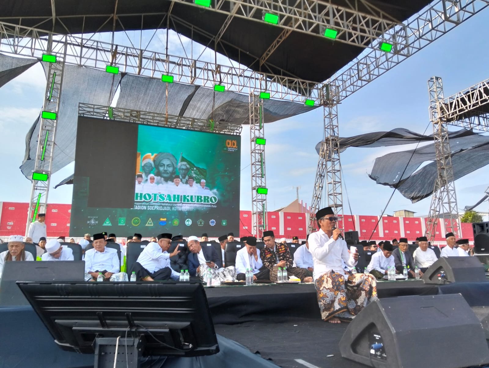 “Dengan spirit hubbul wathan minal iman, NU menempatkan kecintaan pada tanah air sebagai bagian dari iman. Namun, besarnya jamaah NU tidak menjadikan warganya sombong. Soal loyalitas terhadap NKRI, NU tidak perlu diragukan lagi. NKRI harga mati,” tegas Mas Ibin, disambut gemuruh takbir dan tepuk tangan para jamaah.
