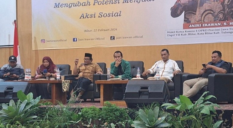 Anggota DPRD Provinsi Jawa Timur dari Partai Golkar, Jairi Irawan, menggelar diskusi bersama awak media se-Blitar Raya di Hall Kampung Coklat, Kecamatan Kademangan, Kabupaten Blitar, Jumat (20/2/2026).