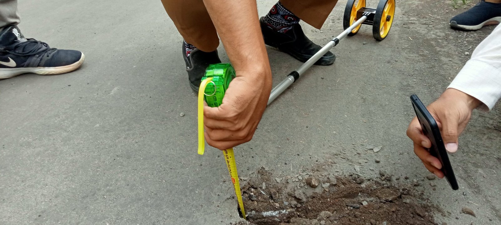 Dengan membawa alat pengukur jalan ( meteran dorong) dan alat ukur manual rombongan melakukan cek fisik aspal .Mulai dari ketebalan aspal juga lapisan dasar aspal.