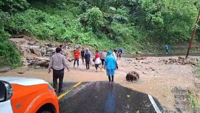 Banjir bandang yang membawa material longsor menyebabkan jalan umum tertutup genangan air dan lumpur, menghambat pergerakan kendaraan dan menimbulkan potensi bahaya bagi para pengguna jalan.