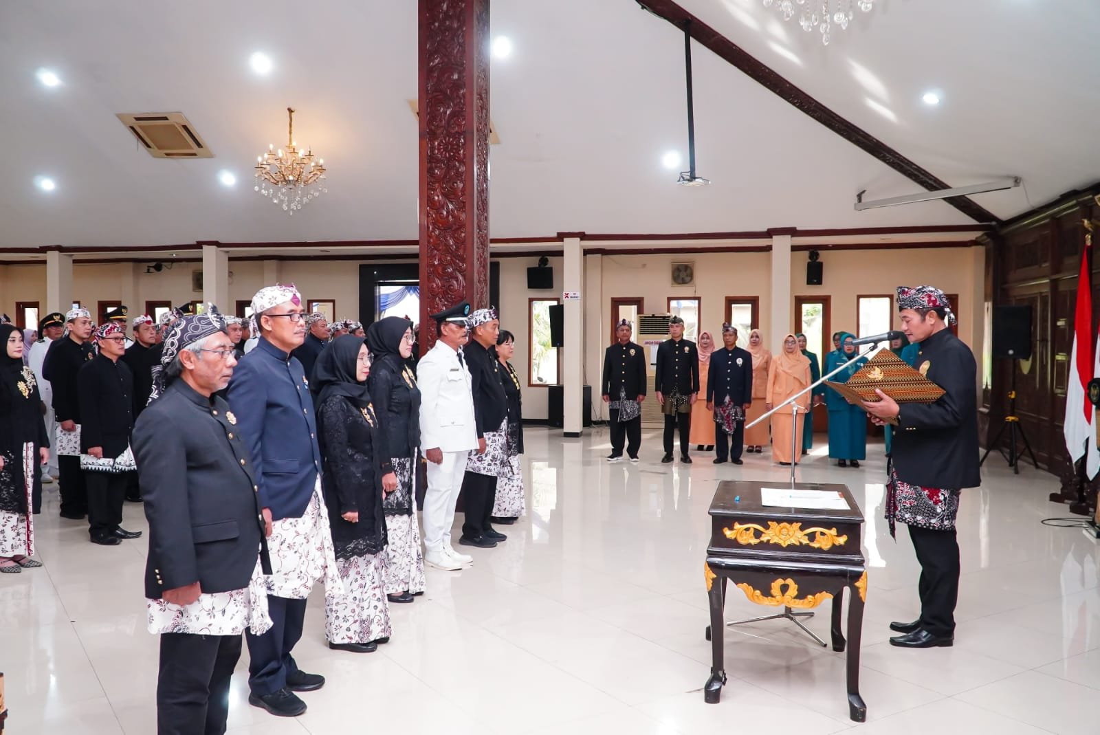 Bupati Lamongan Yuhrinur Efendi melantik 96 pejabat tinggi pratama, administrasi, dan pengawas dilingkungan Pemerintah Kabupaten Lamongan, di Pendopo Lokatantra Kabupaten Lamongan, Jumat (9/5/2025).