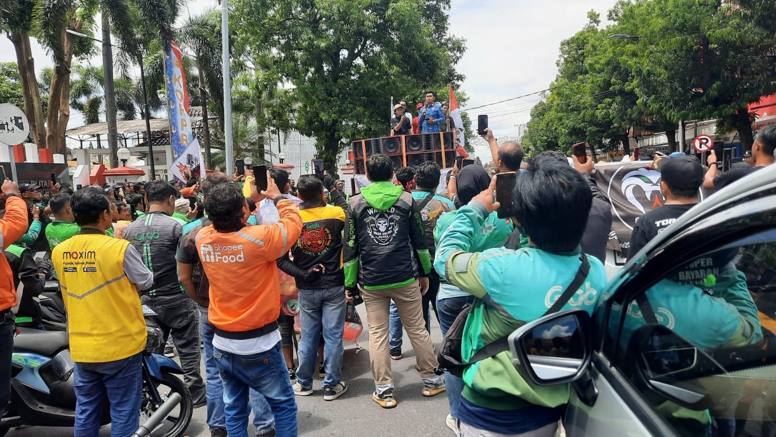 Ruas jalan di sekitar lokasi aksi dipenuhi pengemudi yang membawa poster tuntutan. Mereka menilai zona larangan jemput itu menjadi sumber persoalan baru bagi pengguna jasa transportasi online, terutama bagi penumpang yang datang dari luar kota.