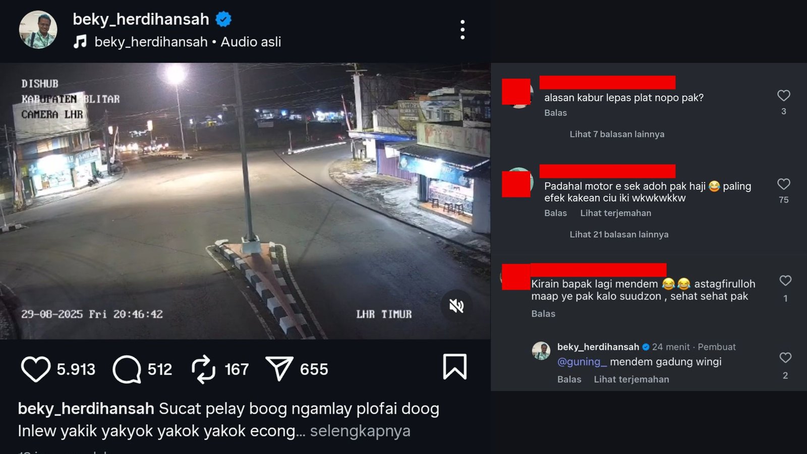 Rekaman video dinas perhubungan Kabupaten Blitar itu diunggah oleh akun Instagram @beky_herdihansah Minggu (31/8/2025).