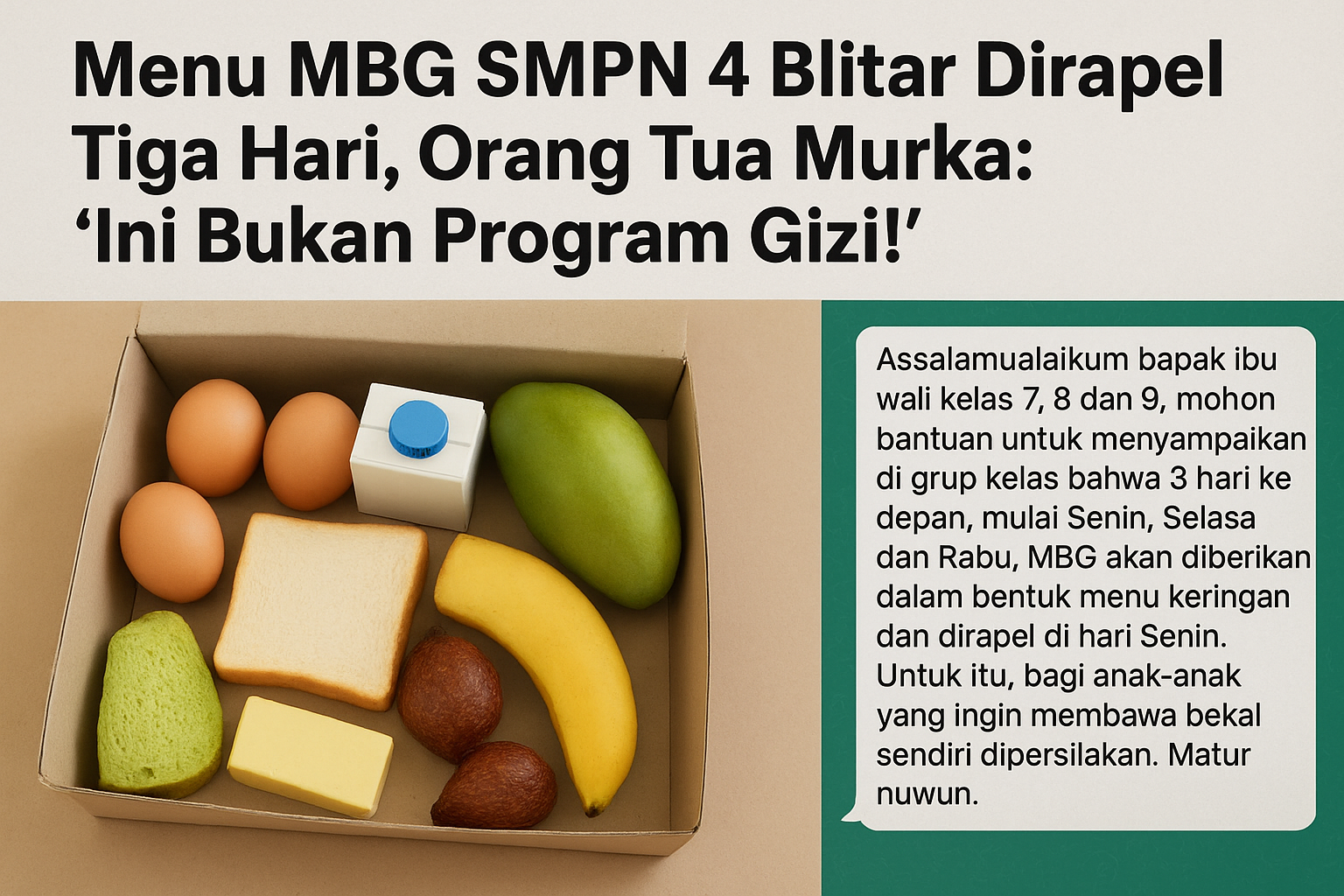 Polemik penyaluran Menu Bina Gizi (MBG) di SMPN 4 Kota Blitar kembali mencuat dan memicu kegaduhan publik. Pasalnya, menu MBG untuk tanggal 8, 9, dan 10 Desember 2025 diduga dirapel menjadi satu kali distribusi, dan parahnya lagi, dibagikan dalam bentuk bahan mentah, bukan makanan siap konsumsi sebagaimana mestinya.