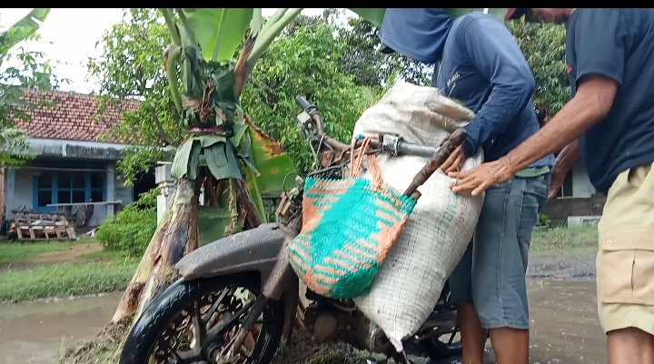 Insiden itu terjadi berawal saat kendaraan dari arah berlawanan berusaha menerobos ke sisi kanan jalan. Karena jaraknya terlalu dekat akhirnya kedua kendaraan sempat senggolan adu setir. Karena oling akhirnya motor pencari rumput seketika terpelanting jatuh ke konangan jalan yang terendam air hujan semalam.